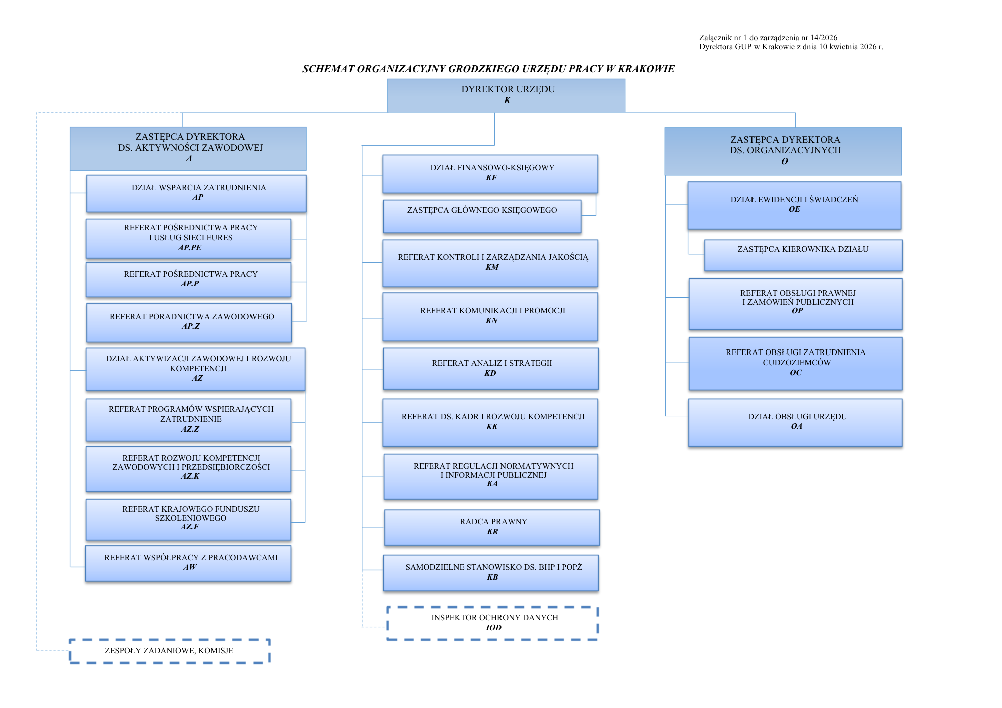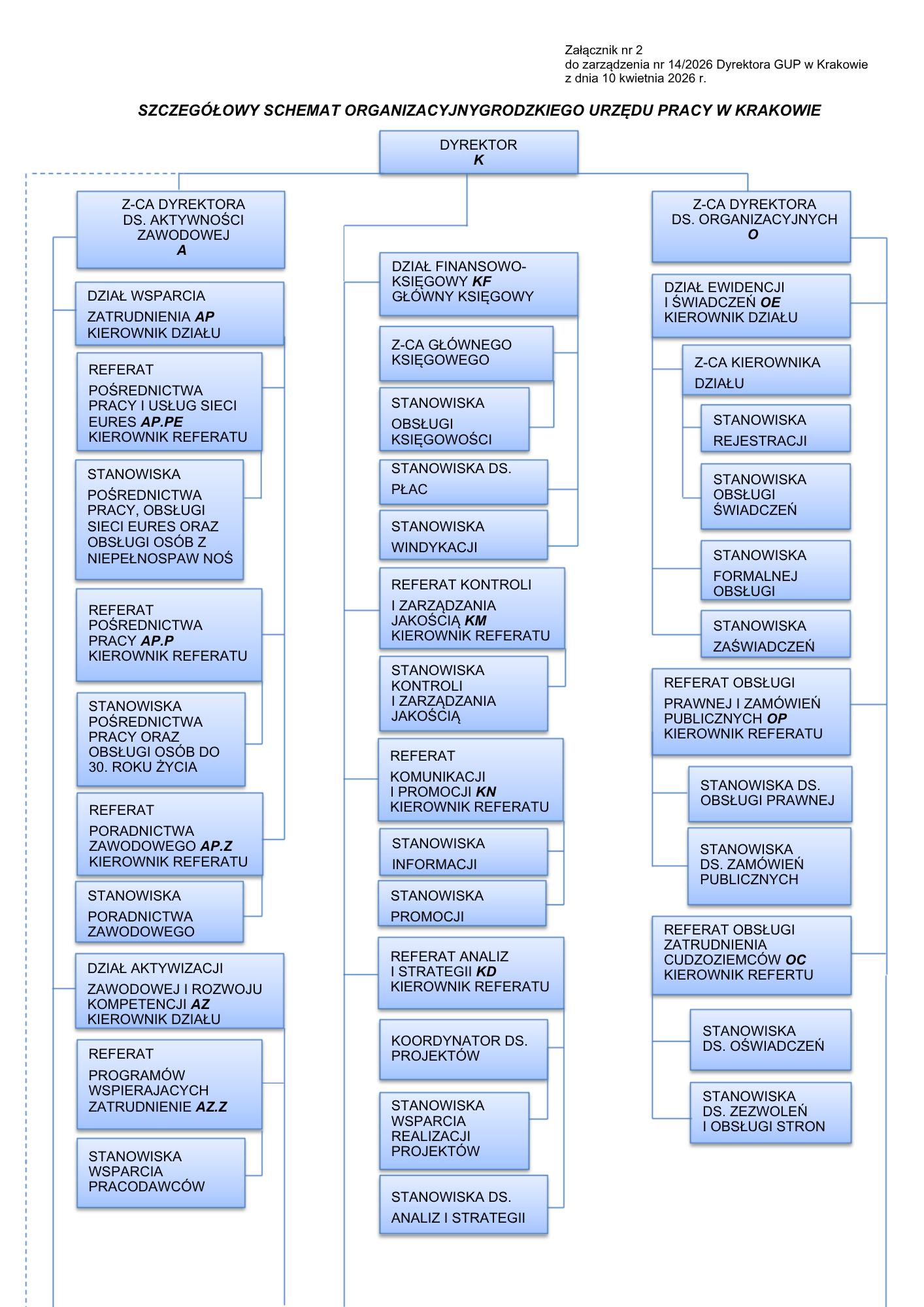 Schemat organizacyjny Grodzkiego Urzędu Pracy w Krakowie można zobaczyć poniżej: